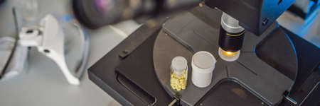 Science lab research safe of new drugs, microscope and pills coronavirus BANNER, LONG FORMAT