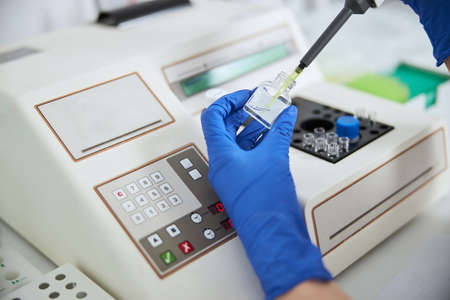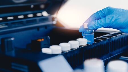 Close up woman hand in a rubber gloves put sample in a glass vial with blue cap into the autosampler rack in HPLC system. High performance liquid chromatography for separation compounds . Scientific and research work at chemical or clinical laboratory