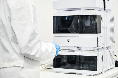 Scientist in rubber gloves and white lab coat standing near high performance liquid chromatography HPLC for separation organic compounds. Analytical chemistry laboratory. Analyzing process.