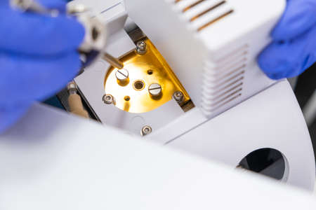 Hand of scientist using a stainless spatula to scoop sample solid from vial to the Fourier Transform Infrared Spectroscopy FTIR pedestal instrument for substance analysis.