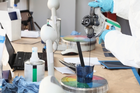 A researcher wearing blue gloves works with a device in a laboratory. The setting includes several microscopes and various equipment. The process involves careful handling and observation.