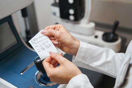 Close-up of female doctor holding the lever and using medical equipment while sitting and working at her office