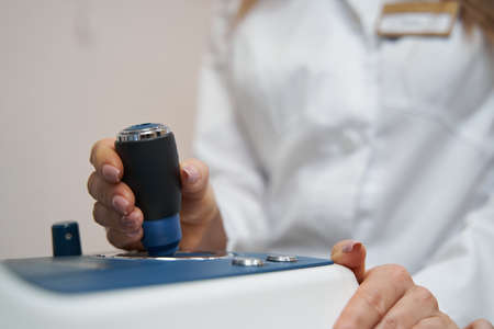 Beauticians hands preparing medical equipment for rejuvenating face and body treatment