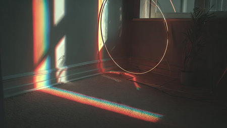 An interior shot features a wall with colorful light beams and shadows. The scene includes a round object, possibly a hoop, next to a window. The warm lighting suggests a daytime setting. The image could be suitable for various creative or editorial projects, including those requiring visual metaphors.