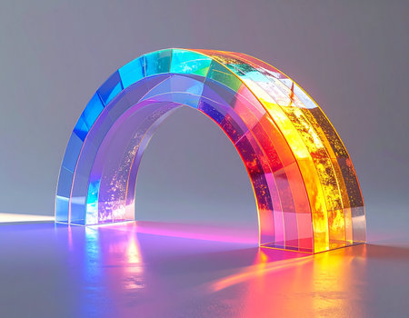 A stunning arch of prismatic glass captures and refracts light, casting a vibrant spectrum of colors onto a reflective surface. This minimalist yet dynamic composition evokes a sense of modern optimism, technological innovation, and the beautiful physics of light.