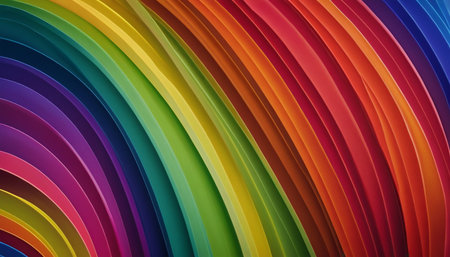 offers a close-up view of layered rainbow waves, showcasing intricate textures and a rich spectrum of vibrant colors. The waves are tightly packed and curve dynamically, creating a sense of depth and complexity. Each layer a distinct hue, ranging from deep purples and blues on the left to bright reds and oranges on the right, with greens and yellows in between. The detailed textures suggest a finely rendered digital creation, with light catching the contours and highlighting the luminous of...