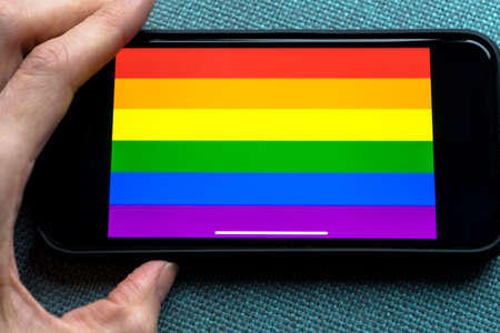 Bright rainbow rays reflect in mobile phone screen surface with dark blurred background. Multicolored beams and reflection in smartphone screen closeup