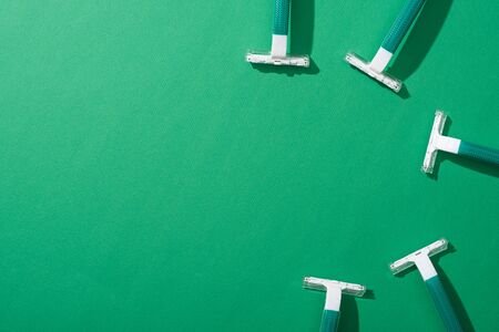 Three blue plastic razors on a green background. Men's accessories for appearance care. Flat lay.