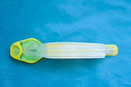 I-gel supraglottic airway tube (size 3) placed on a blue background, medical device used for airway management, anesthesia, and emergency resuscitation in hospitals and prehospital care.
