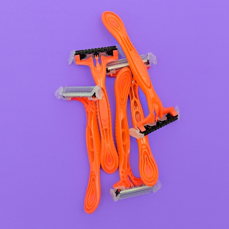 Disposable female razor on a pink background. A tool to remove hair from the skin. Female depilation and hygiene. Body care. Top view, copy space, stylish magazine concept