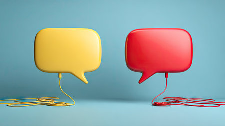Two vibrant speech bubbles, one yellow and one red, float against a solid blue backdrop. Rendered in a 3D style, they feature smooth surfaces and subtle shadows. The image suggests dialogue or conversation, illuminated with soft lighting. Ideal for illustrating concepts in marketing, presentations, or website design.
