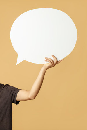 Hand holding an empty speech bubble at background.