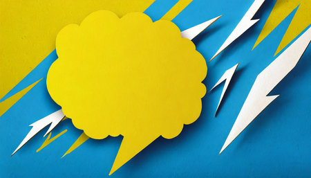 handmade paper cutout pop art comic background with speech bubble cartoon flat style in yellow and blue color lightning concept