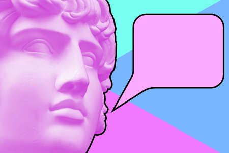 Modern creative graphic sculpture with multi background. Digital texture with antique statue head in zine style. Contemporary art poster. Funky unusual design. Fashion aesthetic culture.Speech Bubble.