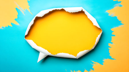 Speech bubble torn paper revealing yellow background on blue canvas with brushstrokes