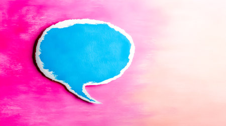 Pink speech bubble with torn edges on a blue and pink pastel background