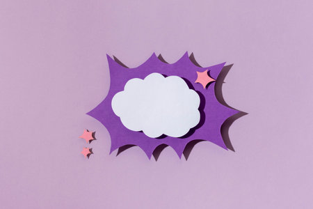 Halloween paper decorations chat bubble mock up on purple background. Flat lay, top view, minimal style, copy space, banner for your site, party invitation, flyer, traditional color