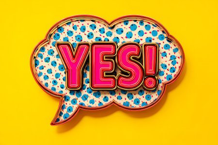 A vibrant neon sign features the word yes in big letters with glowing lights, set in a playful speech bubble. It stands out against a dark, textured background.