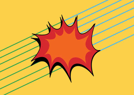 A bold yellow speech bubble with thick black outline, surrounded by vibrant comic style motion lines and colorful background
