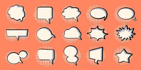 Retro speech bubbles templates set. Colorful cartoon communication design with text and texture. Vector comic elements isolated on black background.