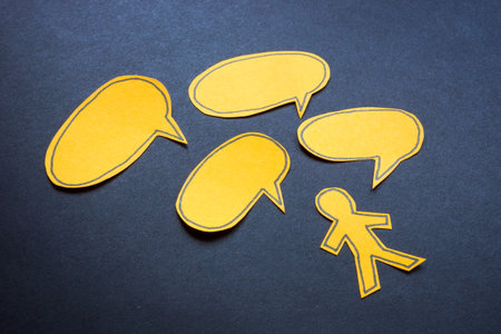 Pros and cons. Group of speech bubbles cut out of cardboard with multiple positions for and against the mainstream opinion.