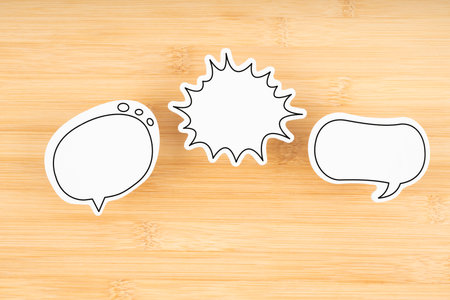 White chat bubbles on wooden background. Horizontal composition with copy space.