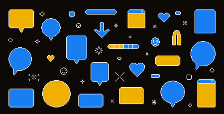 Pixel art speech bubbles. 8 bit text boxes with hearts, arrows and sparkles. Rectangle and round chat frames. Dialogue balloon icons in retro 90s style. Digital message borders. Vector set illustration.