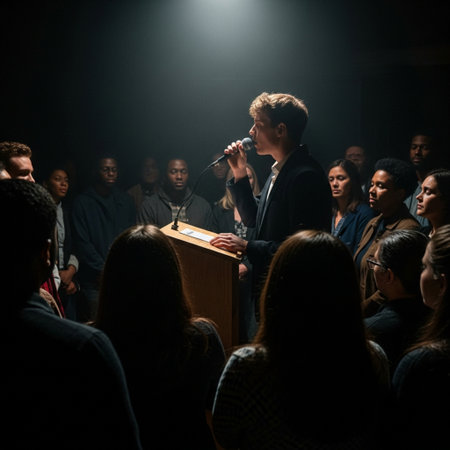 Young activist passionately addresses a crowd, calling for social justice in a lively atmosphere.