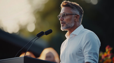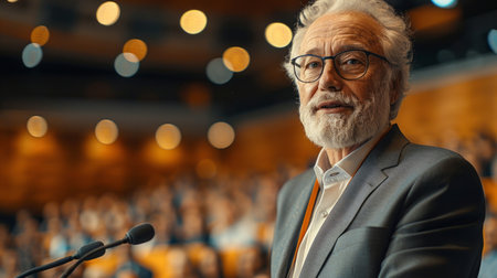 Businessman giving an inspiring presentation at a corporate conference, backlit by a warm spotlight