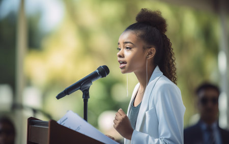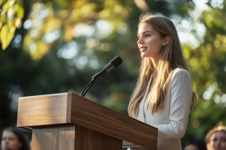Young woman politician gives empowering speech from outdoor podium, embodying leadership, youth, and civic voice.