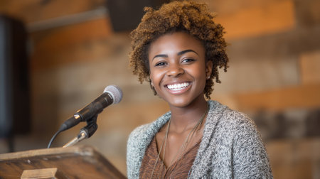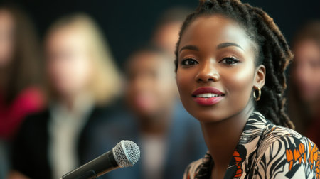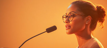 Public Speaking Event Featuring a Confident Female Speaker Presenting in Front of a Microphone With Two Blurred Audience Members in the Background Generative AI