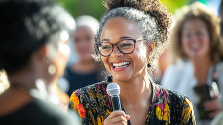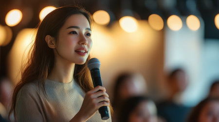 Confident Woman Speaking into a Microphone at a Public Event. High quality photo