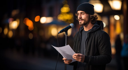An intense, cinematic, side profile silhouette of a poet delivering a powerful spoken word performan