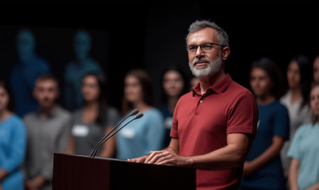 Man motivational speaker on stage, talking about success and leadership. Generative AI.