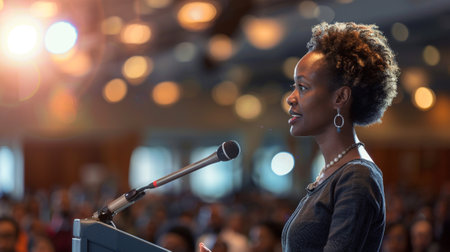 Female speaker with braided hair addresses a captivated audience from a podium, creating an atmosphere of motivation and engagement in a large venue