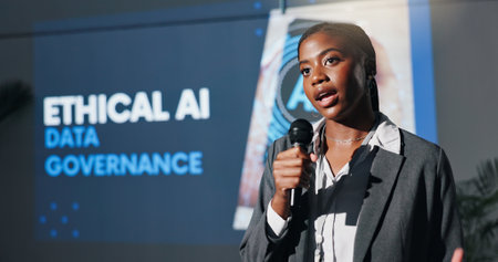 Podium, presentation and speech with business black woman in auditorium for ethical AI conference. Forum, microphone and stage with African speaker in convention center for privacy of information