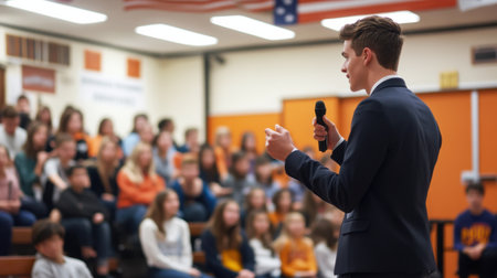 A man stands in front of a crowd of people, holding a microphone. The man is dressed in a suit and tie, and the audience is made up of students. The atmosphere is formal and professional