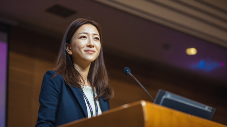 A middle-aged Asian woman with long black hair, wearing a navy blazer and white blouse, delivers a presentation at a wooden podium in a high-tech seminar hall with LED screens.