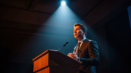 A man in a suit speaks at a wooden podium, illuminated by a spotlight against a dark background. The scene suggests an indoor event with dramatic lighting emphasizing the speaker. This image could be used for various commercial or editorial purposes, such as presentations or public speaking visuals.