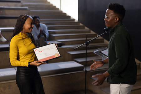 Woman receiving certificate from man on stage during business seminar. Award, achievement, recognition, professional, accomplishment, presentation