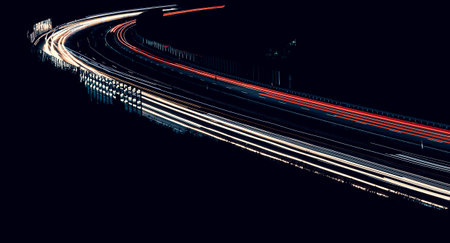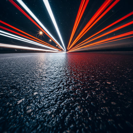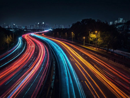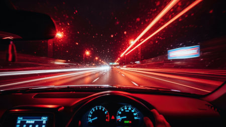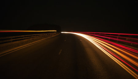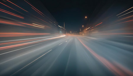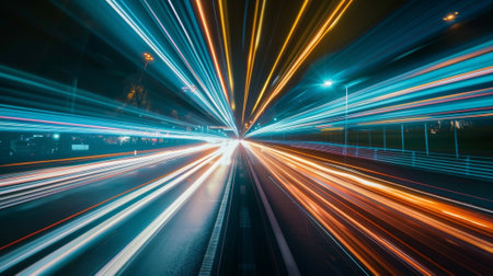 Experience the thrill of a night drive with vibrant light trails capturing the dynamic motion and energy of the urban landscape from a unique perspective.