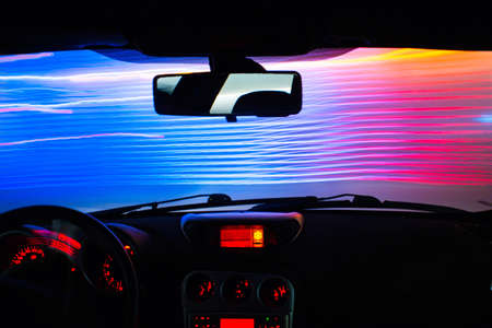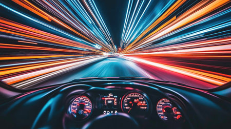 This image captures the interior of a car at night, focusing on the steering wheel and dashboard while in motion. Dynamic streaks of light create a vibrant visual effect against the dark background. The scene suggests speed and travel, suitable for projects related to transportation or visual effects.