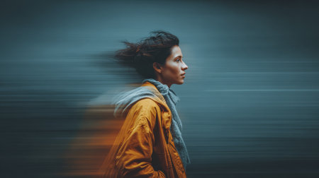 A woman walks briskly through a city street during dusk, her yellow jacket and scarf catching the wind. The background is blurred, highlighting her swift movement and focused expression.