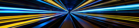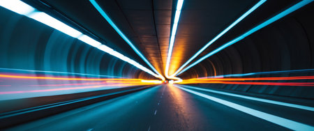 Speeding through a vibrant urban tunnel at night emphasizes movement and light dynamics
