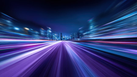 Experience the exhilarating energy of a vibrant city at night with this dynamic image showcasing blurred lights and a futuristic skyline.