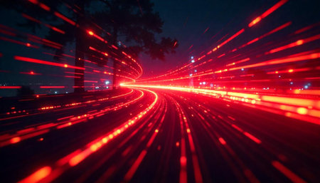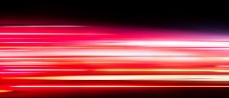 This abstract image showcases dynamic light trails that convey a sense of speed and motion against a dark backdrop, making it ideal for technology and energy projects.