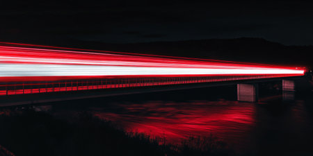 Red and white light trails flowing in parallel lines across a bridge at night, contrasting sharply with the dark sky and water below.