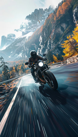 Motorcyclist riding on the road in the mountains. Motion blur