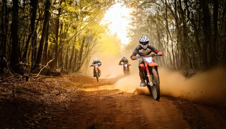 Motocross rider on a dirt road in the forest during the race