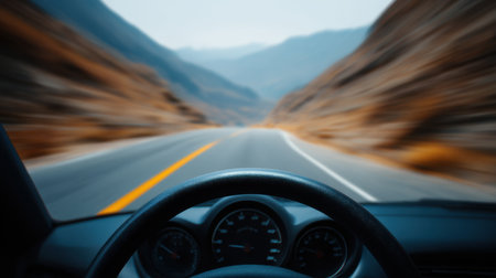 A captivating view from inside a car, showcasing a winding road surrounded by stunning mountains. The motion blur effect conveys speed and adventure, perfect for travel enthusiasts.